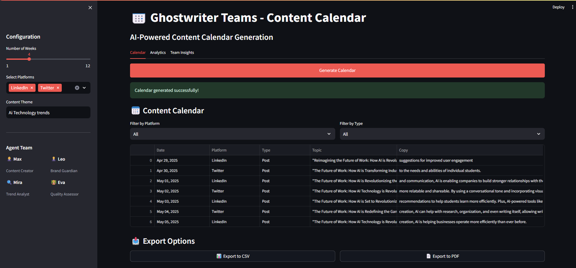 **Ghostwriter Teams** is your local AI-powered creative department — built to help marketers, creators, and startups brainstorm, write, plan, and critique content like a full-scale agency.